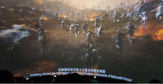穿越序厅的光影长廊,便踏入“血火洗礼”的壮阔场景。行进式步道缓缓推移,氛围骤然凝重,三维声场中,枪炮轰鸣、冲锋号角、呐喊交织回荡,逼真得令人身临其境。两侧影像画面疾速切换,五次反“围剿”的浴血奋战、突破封锁线的英勇冲锋、血战湘江的悲壮突围,红军战士在枪林弹雨中奋勇向前的英姿历历在目。那段生死存亡的危机时刻,经数字技术还原愈发真切,让在场者深切体悟红军“不畏艰难险阻,不惜牺牲一切”的伟大精神,更直观领悟“铁的纪律”是革命胜利的根本保障。