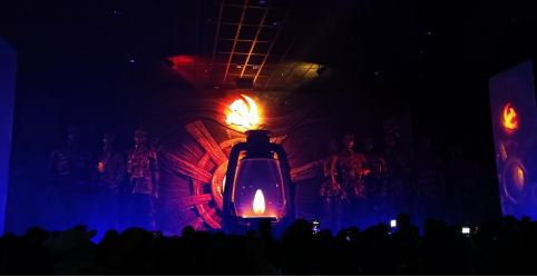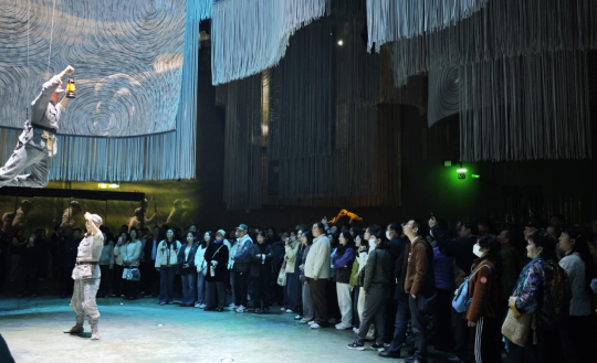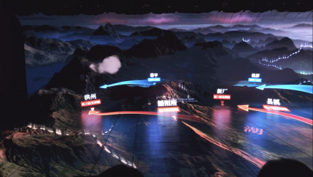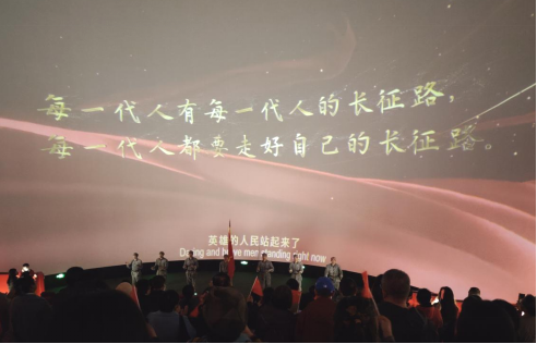 穿越“砥砺征途”的严寒风雪,最终抵达巨型环幕影院。巨大的荧屏上,红军三大主力胜利会师的盛景缓缓展现:“胜利丰碑”的壮丽画面配合激昂的配乐,瞬间点燃了现场所有人的激情,令人热血沸腾。“每一代人有每一代人的长征路,每一代人都要走好自己的长征路”“英雄的人民站起来了”的醒目字样,在光影中熠熠生辉,既定格了历史的辉煌,更指引着未来的方向。